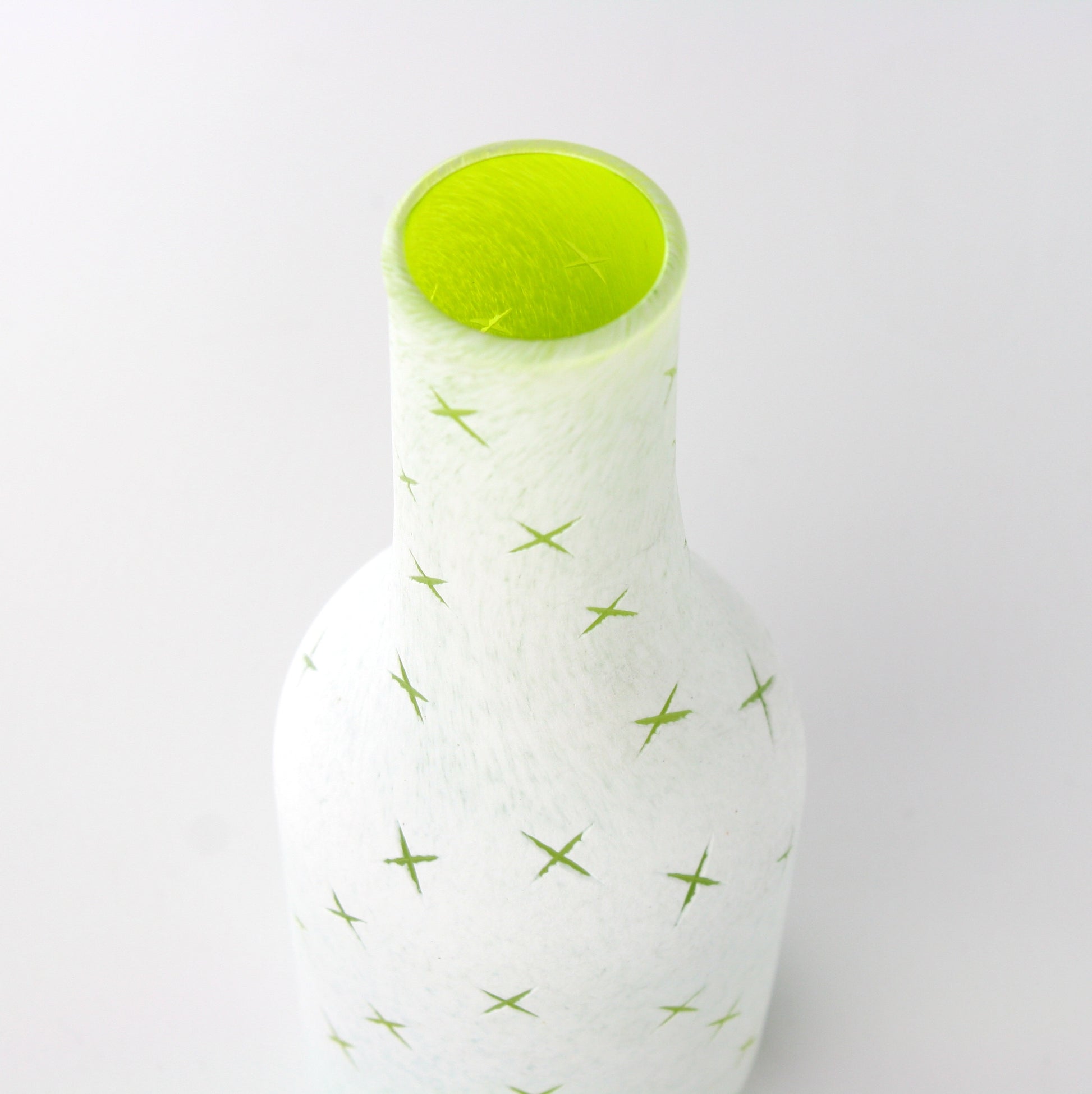 An electric lime-yellow also known as Chartreuse color is the base color for this Bottle Vase. The signature Ultra Lit " X marks the Spot " is all over this beautiful vessel.
